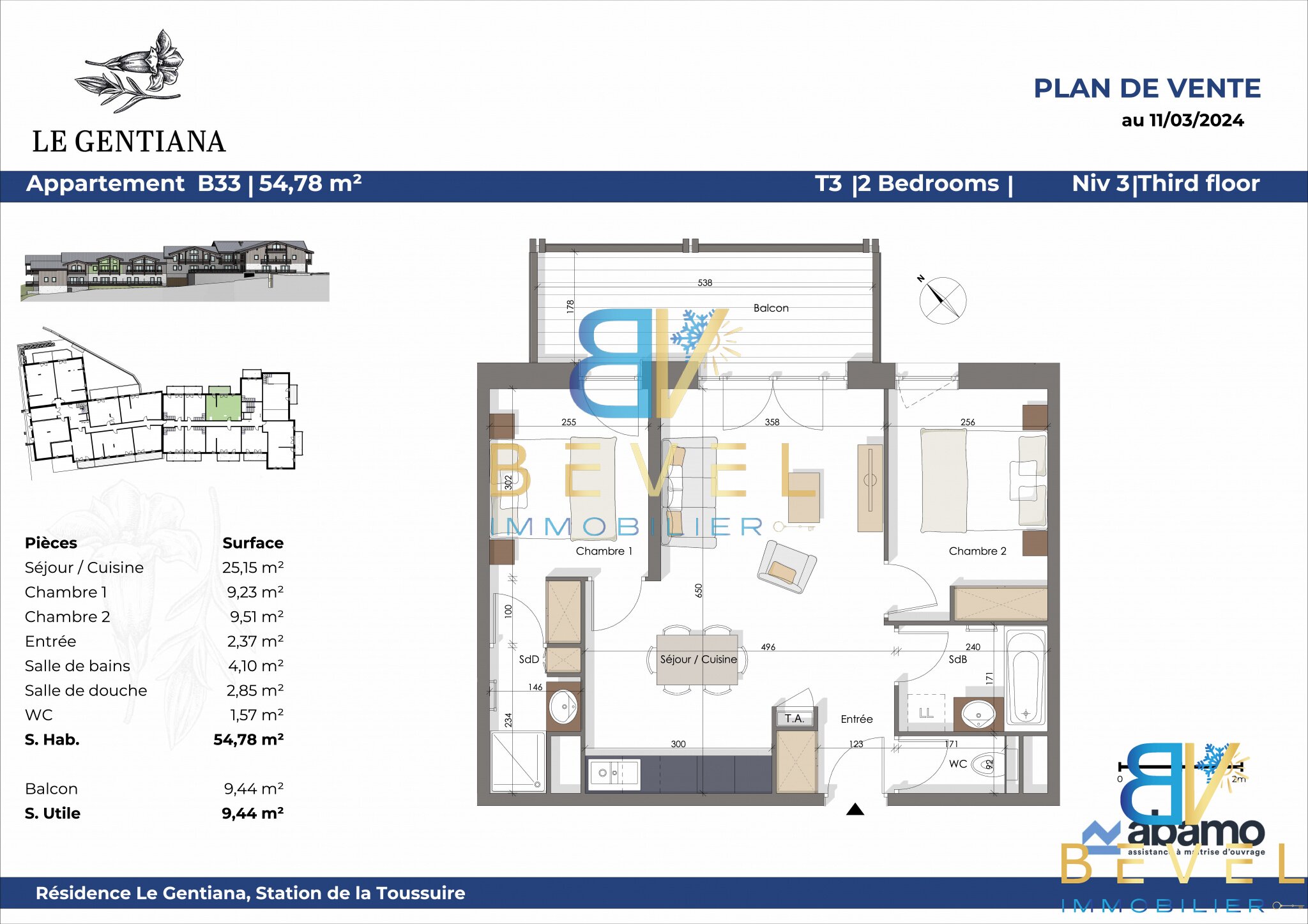 T3 54,78 m2 NORD-EST - LA TOUSSUIRE - LE GENTIANA - BALCON - GARAGE & PARKING - LOCAL A SKIS